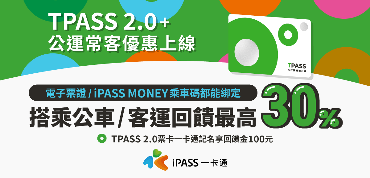 1. iPASS MONEY電支支付帳戶可於114年12月1日起開始綁定TPASS 2.0+常客優惠,綁定成功即生效,使用 2.回饋金額採:各回饋項目「各別運具分別計算×回饋比例」方式計算;如遇小數位數,採無條件進位至整數方式計算。 3. 前揭搭乘金額以iPASS MONEY乘車碼實際交易扣款金額認定。 4. 每電之帳戶每個月國道拆分回饋金領取上限金額:2,500元,其它運具不限。 備註:國道客運購買票時,會先在運具業者官網或APP先訂位,付款的時候跳轉至 iPASS MONEY 進行付款 |