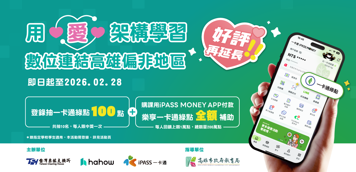 - 在完成資料登錄後,高雄市指定學校就學之學生至【Hahow 好學校】官網購買課程,且以 iPASS MONEY APP 完成付款,即可依實際課程支付之金額獲得一卡通綠點全額回饋。