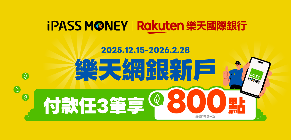 【樂天銀行】樂天網銀新戶,用 iPASS MONEY 付款任 3 筆享一卡通綠點 800 點回饋
