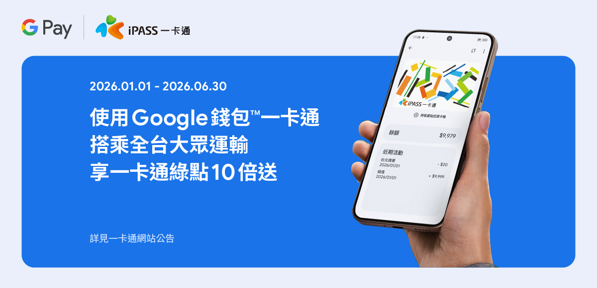 - 回饋入帳時該 Google 錢包™一卡通儲值卡須為有效卡,若於活動期間回饋前後,一卡通持卡人遭強制停用、申請停用(含一卡通退卡)、結清銷戶、掛失等情形者,一卡通公司得撤銷其回饋資格。